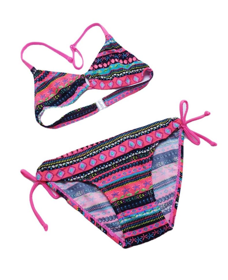 Детски бански костюм от 2 части - горнище и долнище за момиче с принт на многоцветни шарки.