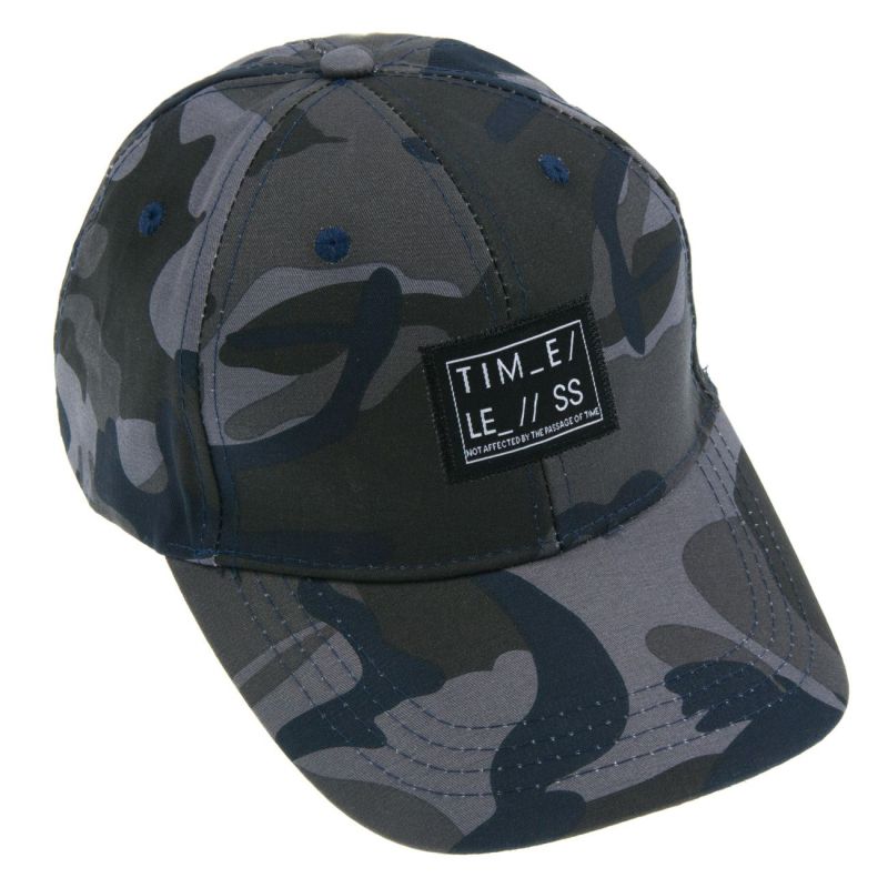 Детска шапка в черно и сиво с маскировъчни шарки, козирка и дискретен надпис в предната част.