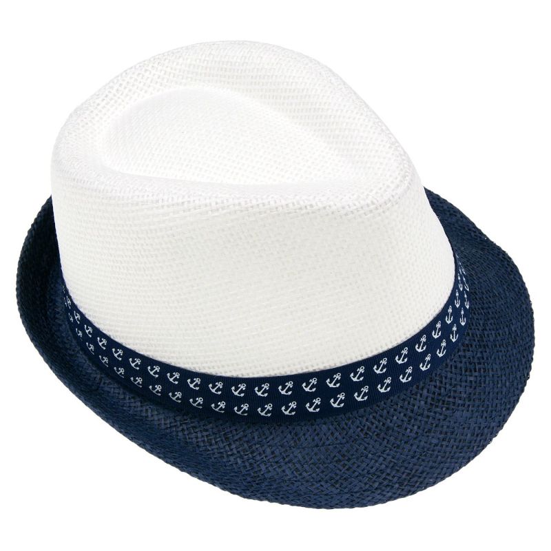 Детска шапка тип бомбе в бял цвят с тъмно синя периферия и лента с принт на котви.