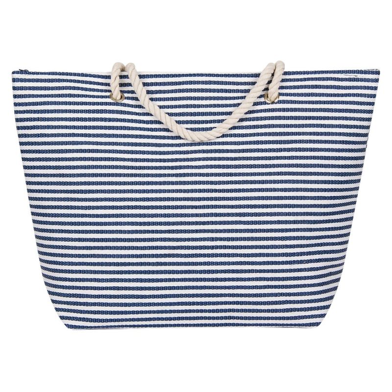 Класическа плажна чанта в синьо-бяло райе и удобни въжени дръжки с дължина 18 см. за носене в ръка или на рамо.