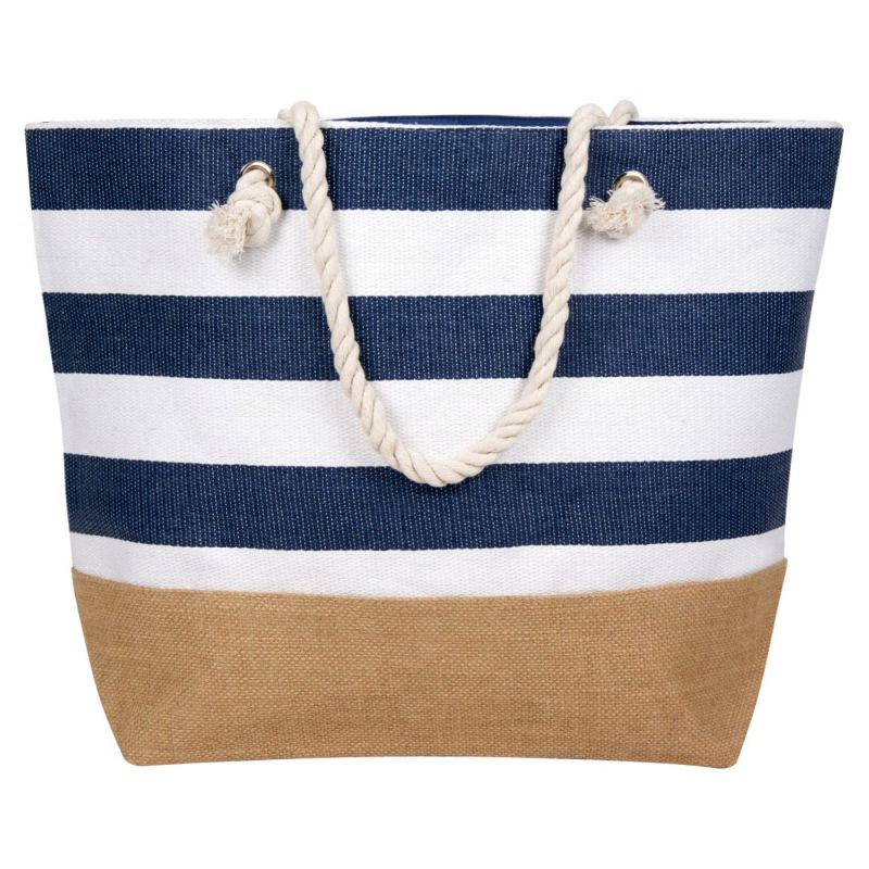 Традиционна плажна чанта в широки синьо-бели ленти и удобни въжени дръжки с дължина 18 см. за носене в ръка или на рамо.