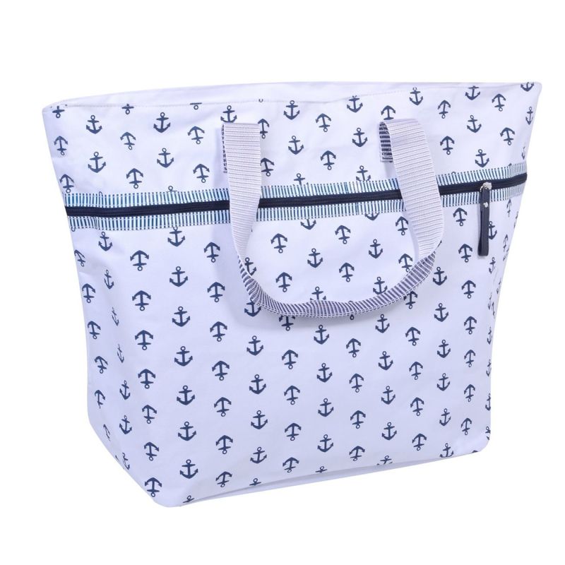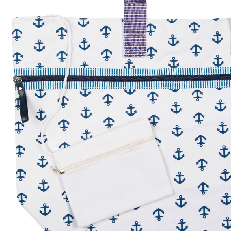 Стилна и практична плажна чанта в бял цвят с принт на котви и цип, изработена от здрав плат с удобни платнени дръжки за носене в ръка или на рамо.
