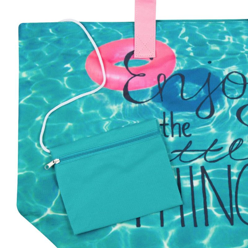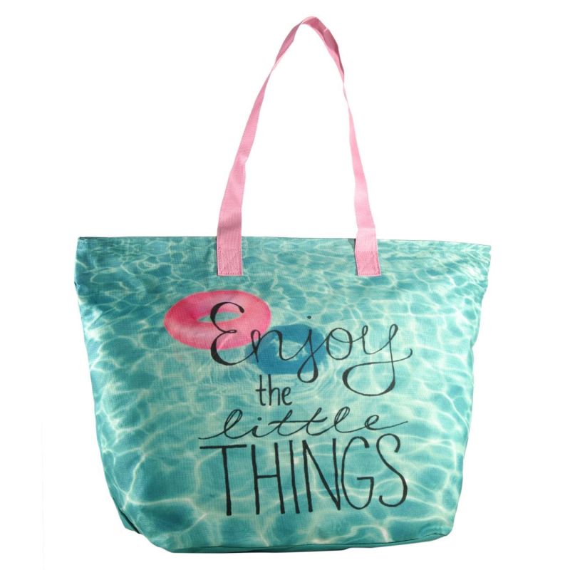 Стилна и практична плажна чанта в цвят тюркоаз с цип и надпис Enjoy the little things, изработена от здрав плат с удобни дръжки с дължина 28 см. за носене в ръка или на рамо.