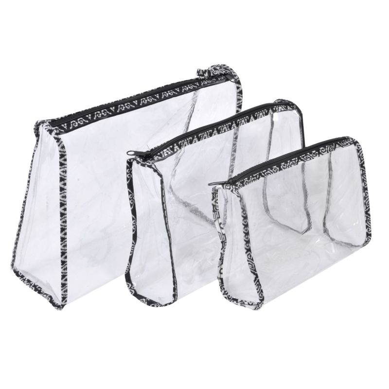 Комплект от 3 броя прозрачен плажен несесер, изработен от PVC с черно-бели кантове и цип по цялата дължина.