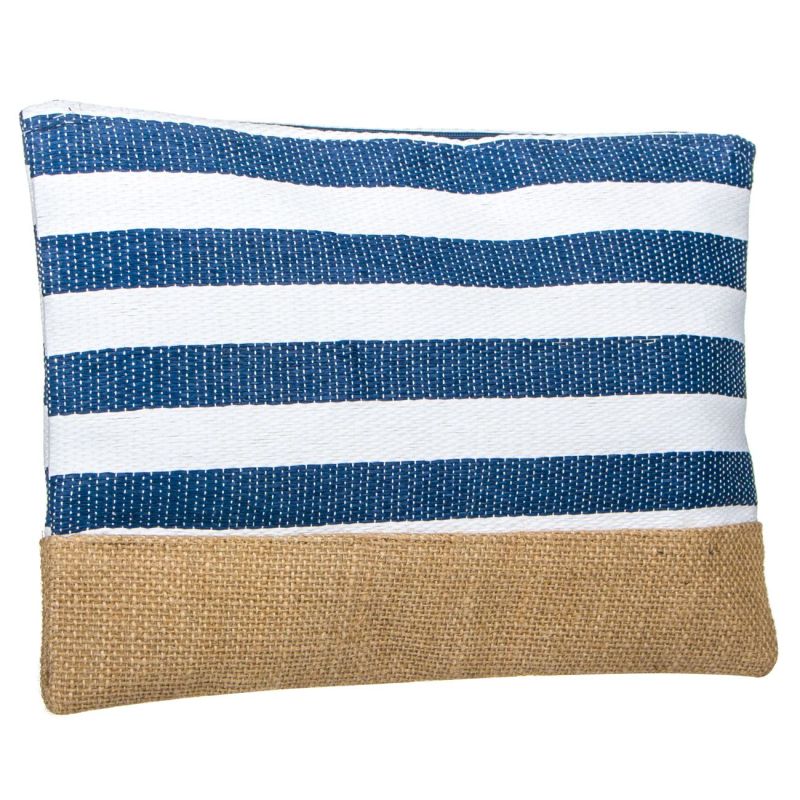 Плажен несесер, изработен от слама в широки синьо-бели ленти с непромокаема подложка и цип по цялата дължина.