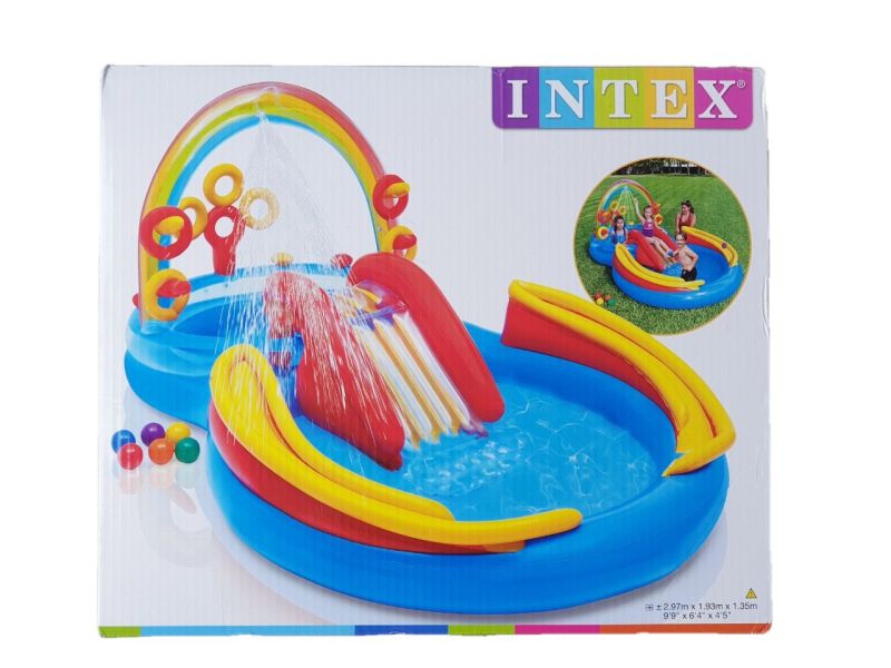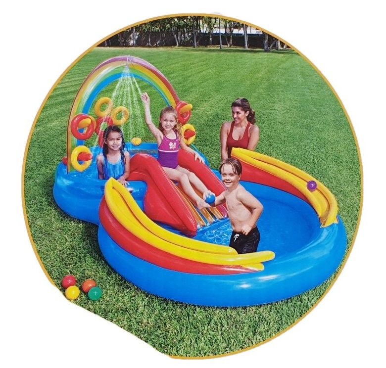 Детски многоцветен надуваем басейн с дълбочина 25 см. във формата на шадраван с водна пързалка с надуваема възглавничка за приземяване и душ-пръскачка, изработен от траен винил. Включва игра с хвърляне на обръчи (с 4 надуваеми обръча) и игра с превъртане на топка (с 6 пластмасови топки с диаметър 8 см.), както и резервно парче за ремонт.