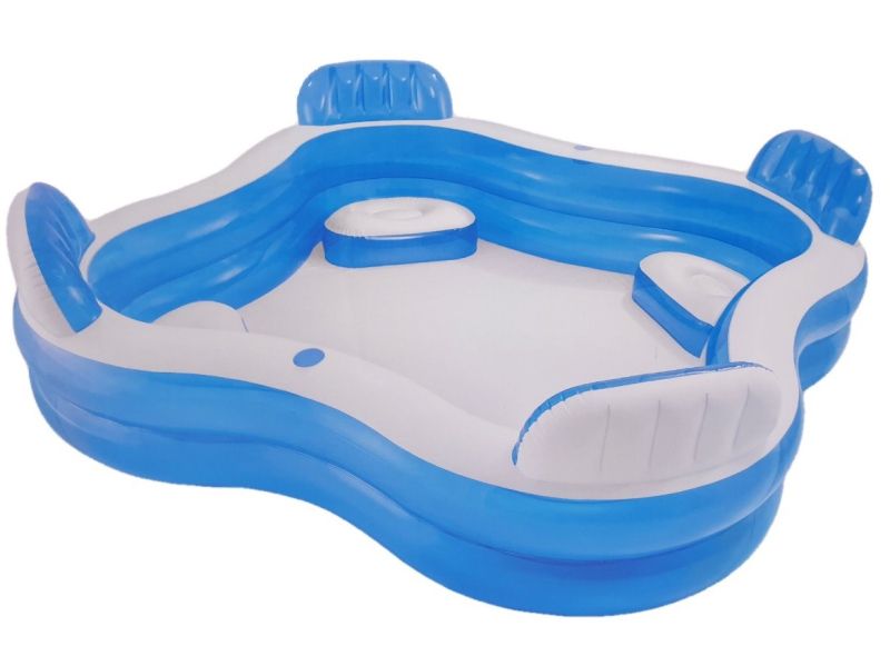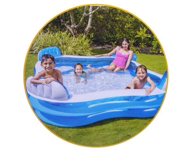 Семеен надуваем басейн в синьо и бяло с вградени надуваеми седалки за 4 души, изработен от особено издръжлив материал. Включва и резервно парче за ремонт.