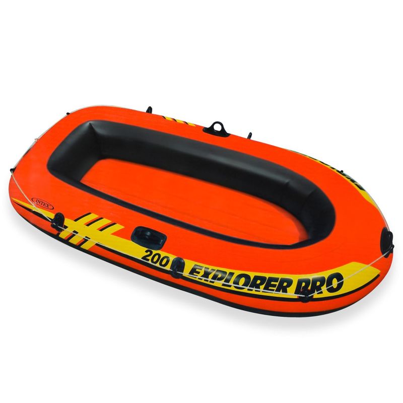 Надуваема лодка за двама души в оранжев цвят със задържащо въже по целия периметър, идеална за плуване и релакс във водата.