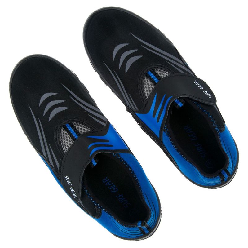 Мъжки аква обувки в черно и синьо, изработени от издръжлива материя за предпазване на краката при гмуркане и шнорхелинг, както във водата, така и по камъчетата.