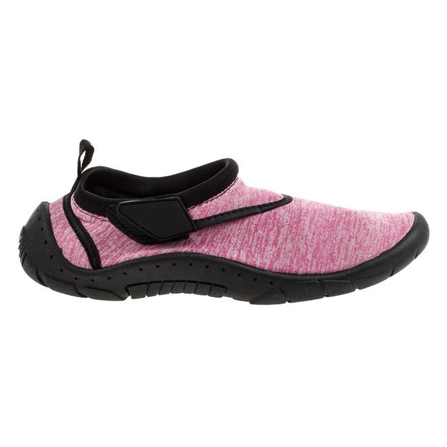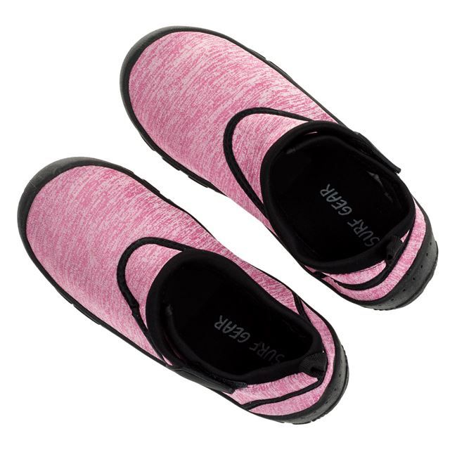 Детски аква обувки в розов цвят с черна подметка , изработени от издръжлива материя за предпазване на краката при гмуркане и шнорхелинг, както във водата, така и по камъчетата.