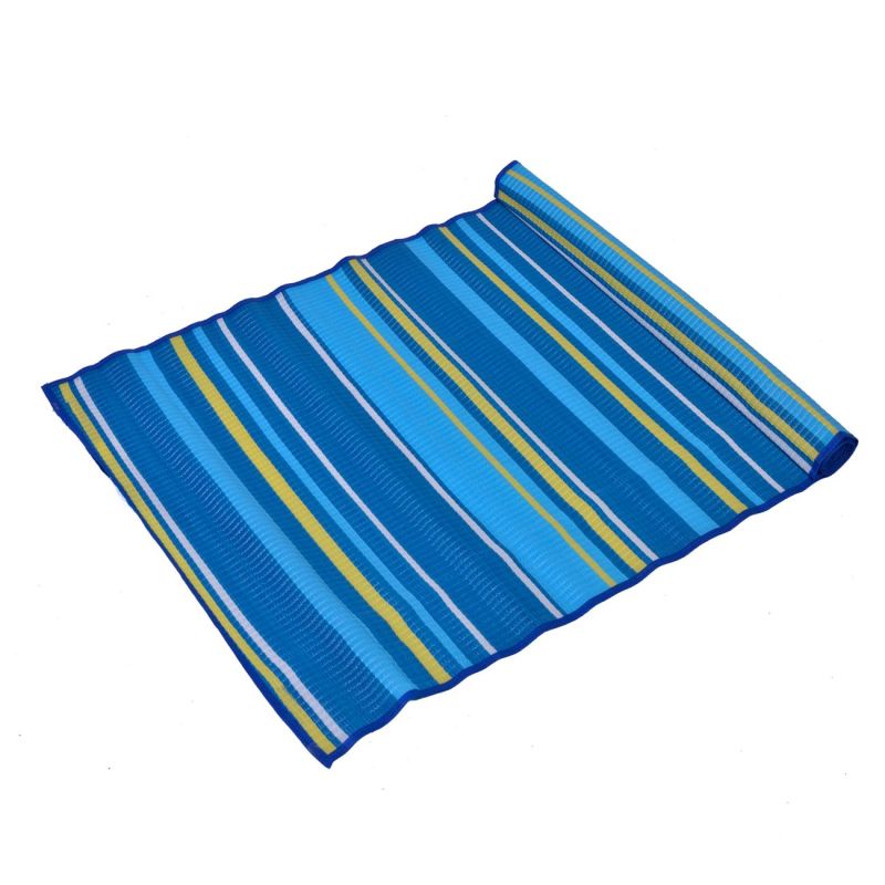 Удобна плажна постелка - тип рогозка, изработена от слама в синьо-жълто райе.