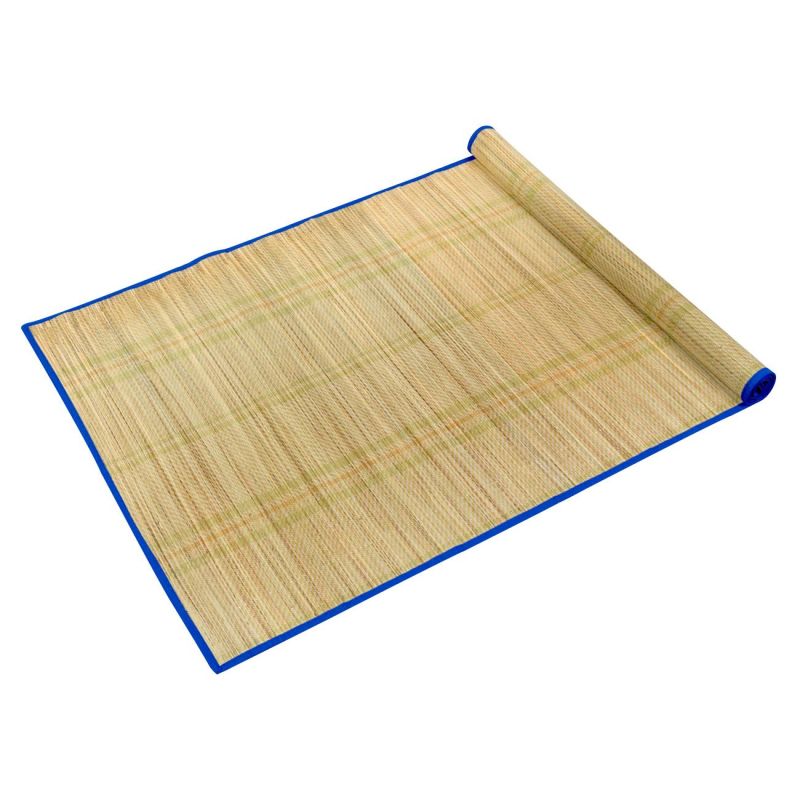 Практична плажна постелка - тип рогозка, изработена от преработен ратан с подшити ръбове в син цвят.