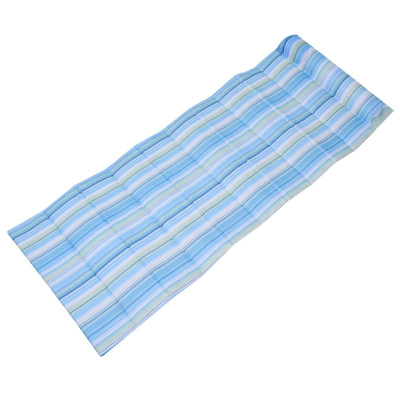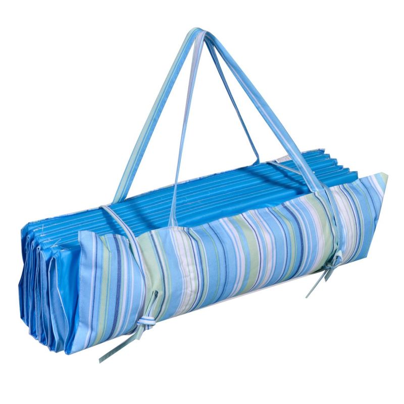 Компактна чантичка в светло синьо райе, която се разгъва и се превръща в удобна рогозка за плаж или пикник.