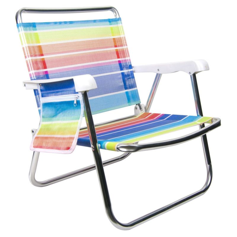 Практичен сгъваем стол с метална рамка и пластмасови подлакътници. Седалката и облегалката са изработени от издръжлив текстил в многоцветно райе.