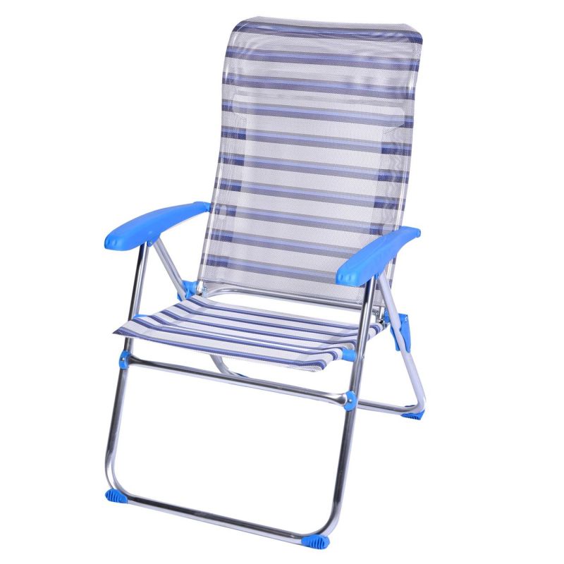 Практичен и удобен плажен стол със стабилна метална рамка, пластмасови подлакътници и противохлъзгащи подложки на краката. Седалката и облегалката са изработени от висококачествен и издръжлив плат в синьо-бяло райе.