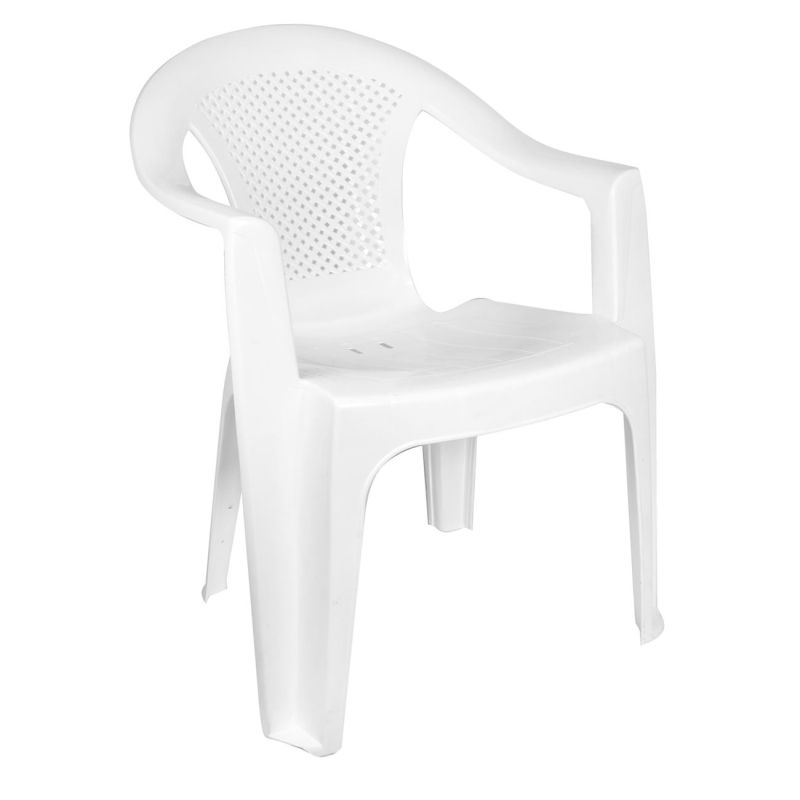 Удобен пластмасов стол в бял цвят с мрежеста облегалка и подлакътници, устойчив на атмосферни условия.