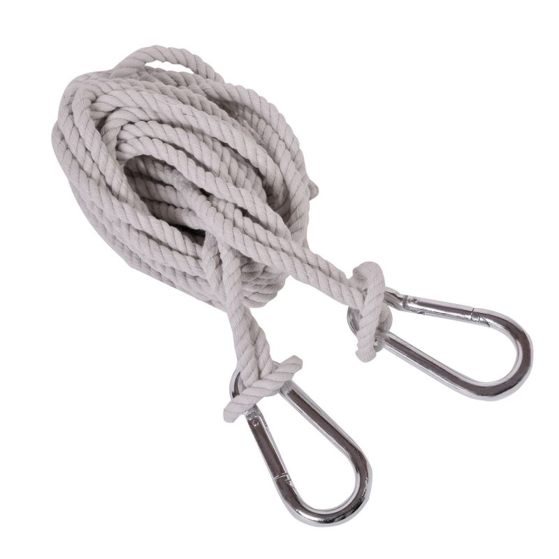 Комплектът съдържа две въжета с дължина 3 м. със стоманени куки с диаметър 1 см., изработени от памук и полиестер, подходящи за закрепване на хамаци и висящи столове.
