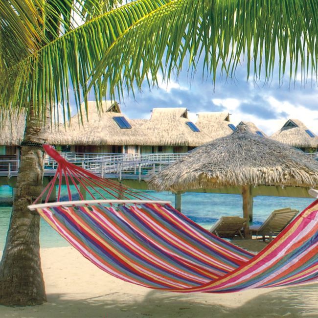 Удобен хамак с дървена рамка и мек, но издръжлив памучен плат в многоцветно райе.
