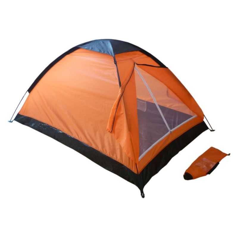 Двуместна къмпинг палатка в оранжев цвят, изработена от издръжлив и непромокаем материал.