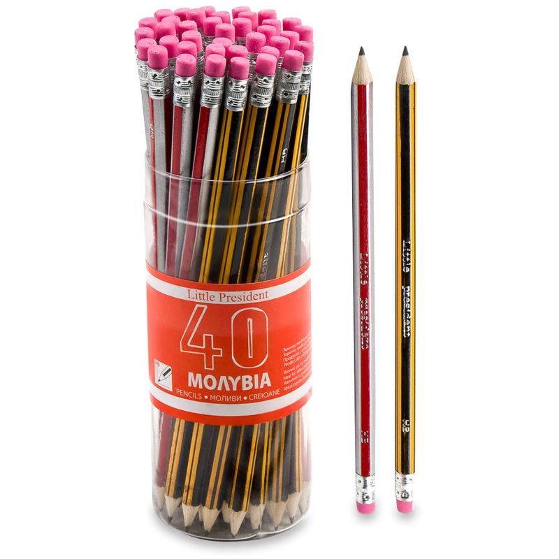 40 броя класически шестоъгълни моливи LITTLE PRESIDENT с гума за удобно триене и мек черен графит. Комплектът също така разполага и с удобна кутия, в която може да съхранявате моливите.