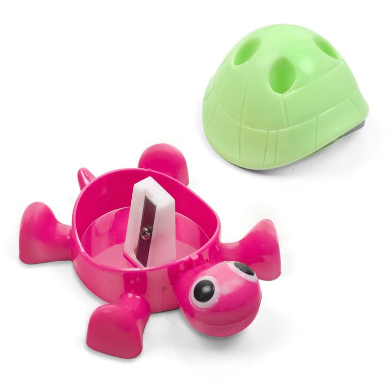 Детска пластмасова острилка в формата на костенурка, която ще се хареса на всяко дете, което обича животните. Може да се използва и като моливник за 4 молива.