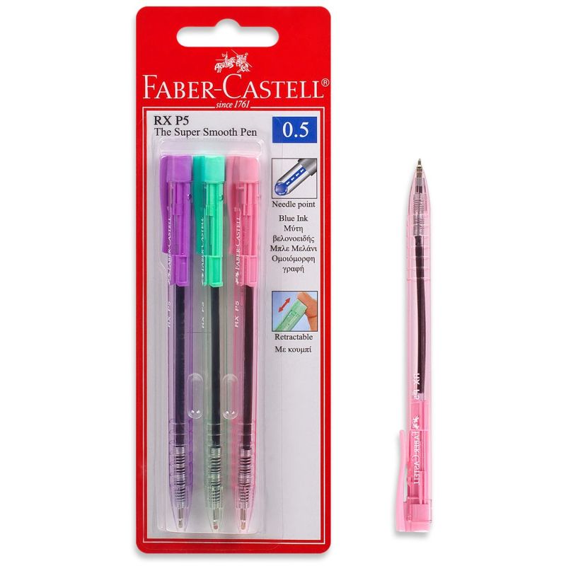 Комплект от 3 броя автоматични химикалки FABER-CASTELL в зелен, розов и лилав цвят с тънък писец със синьо мастило за писане върху всякакъв вид хартия.