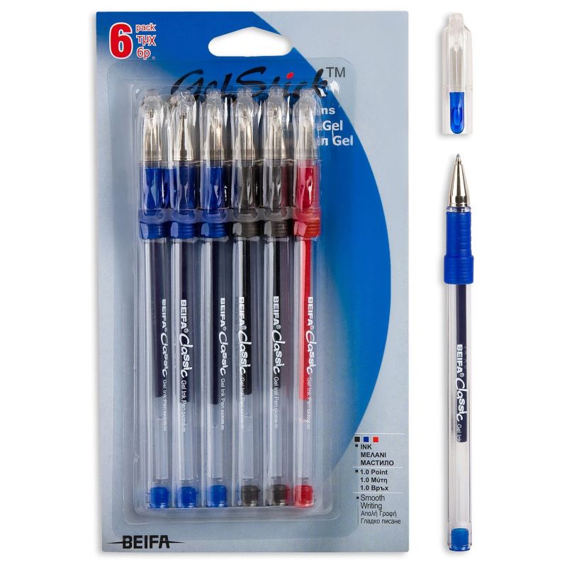 Комплект от 6 броя прозрачни химикалки с капачки с гел мастило в три цвята - 3 сини, 2 черни и 1 червена за гладко писане върху всякакъв вид хартия.
