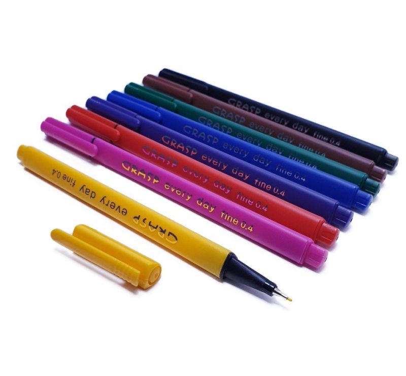 Комплект от 8 броя мини тънкописци в триъгълна форма с предпазна капачка в различни цветове - черен, кафяв, зелен, син, лилав, червен, розов и жълт за писане, оцветяване или подчертаване върху всякакъв вид хартия.