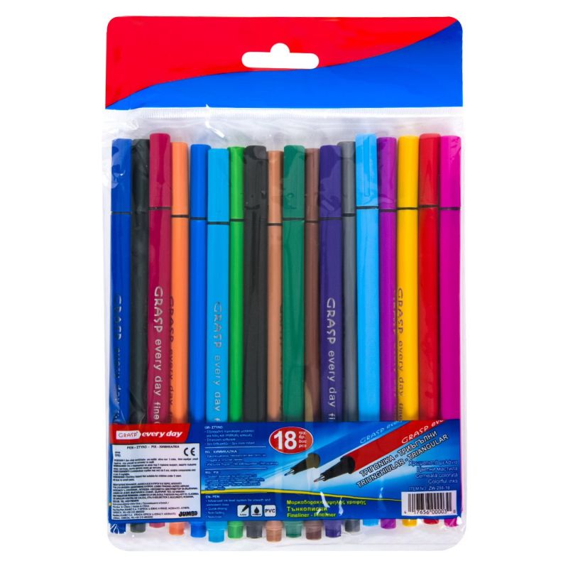 18 броя тънкописци в триъгълна форма с предпазна капачка в различни цветове и нюанси за прецизно писане, оцветяване или подчертаване върху всякакъв вид хартия.