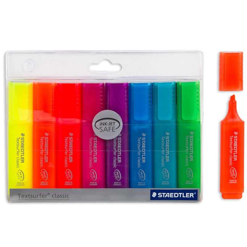 Практичен комплект от 8 броя текст маркери STAEDTLER в 8 цвята - жълт, оранжев, червен, цикламен, лилав, син, светло син и зелен.