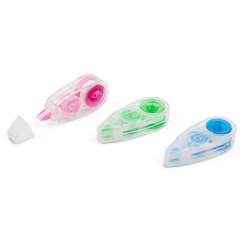 Комплект от 3 броя разноцветни мини коректори лента за сухо коригиране върху хартиена повърхност.
