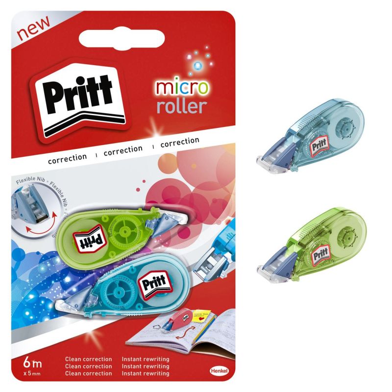 Комплект от 2 броя разноцветни мини коректори лента PRΙΤΤ за сухо коригиране върху хартиена повърхност.