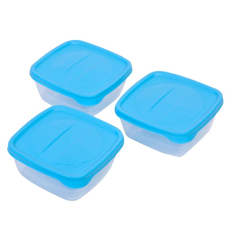 Комплект от 3 броя прозрачни пластмасови кутии за съхранение на храна с капак, гарантиращ плътно затваряне без опасност от разливане.