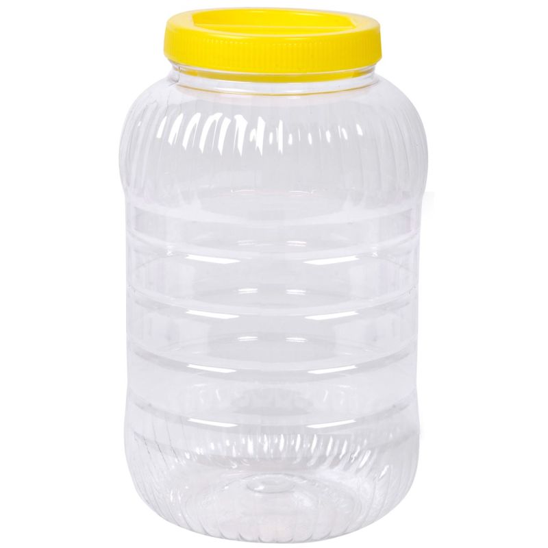 Прозрачен пластмасов буркан за маслини или туршия с удобен капак на винт, осигуряващ плътно затваряне.