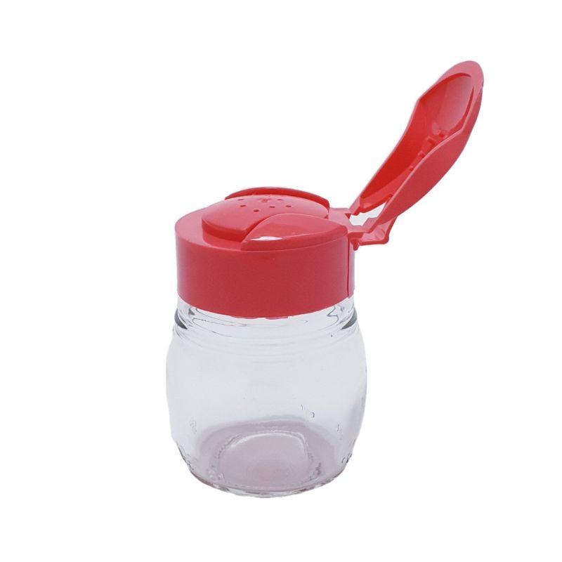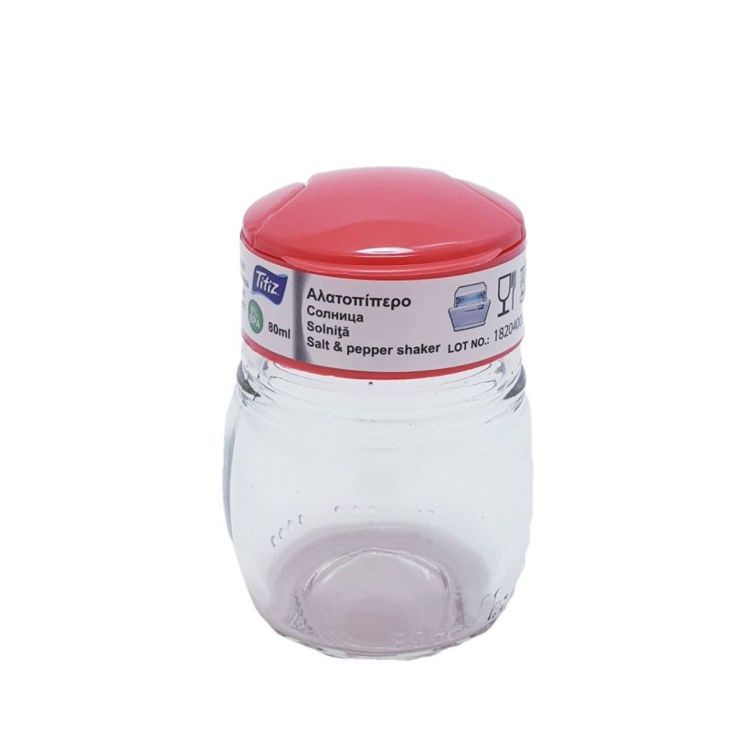 Прозрачна стъклена солница / пиперница с цветна пластмасова капачка на винт. Капачката разполага с предпазител против разсипване при обръщане.