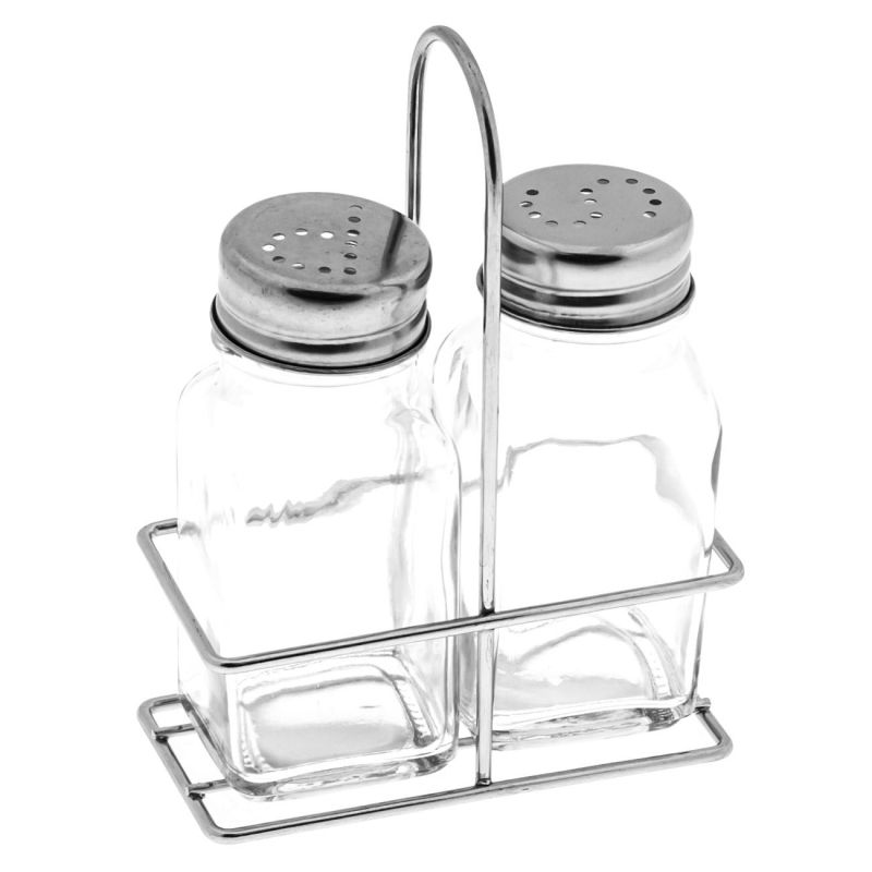Комплект стъклена солница и пиперница с метална капачка с дупки във формата на буквите S (сол) и P (пипер) и практична метална поставка.