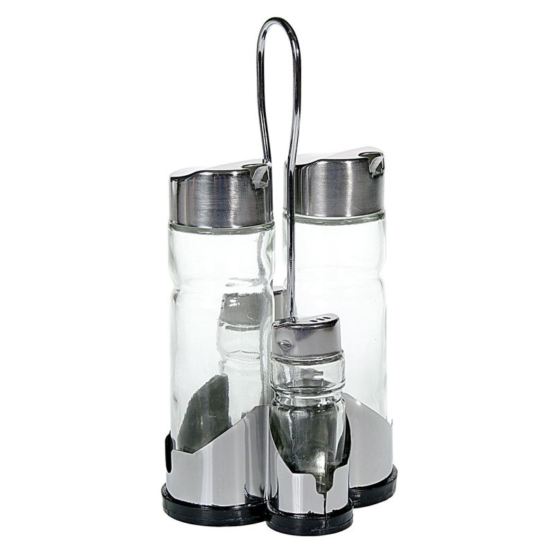 Комплект оливерник от 4 части - 2 броя стъклени бутилки за олио и оцет, стъклена солница и пиперница с метални капачки в масивна метална поставка с удобна дръжка. Перфектни за овкусяване на ястия и салати.