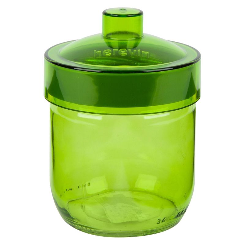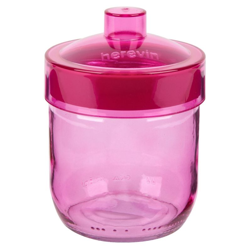 Цветен стъклен буркан с капак, осигуряващ плътно затваряне, което запазва свежестта на продуктите в него.