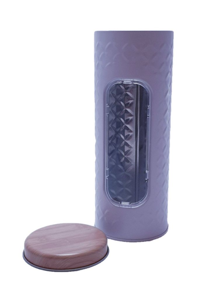 Метална кутия за съхранение с цилиндрична форма и капак, осигуряващ плътно затваряне без опасност от разсипване.