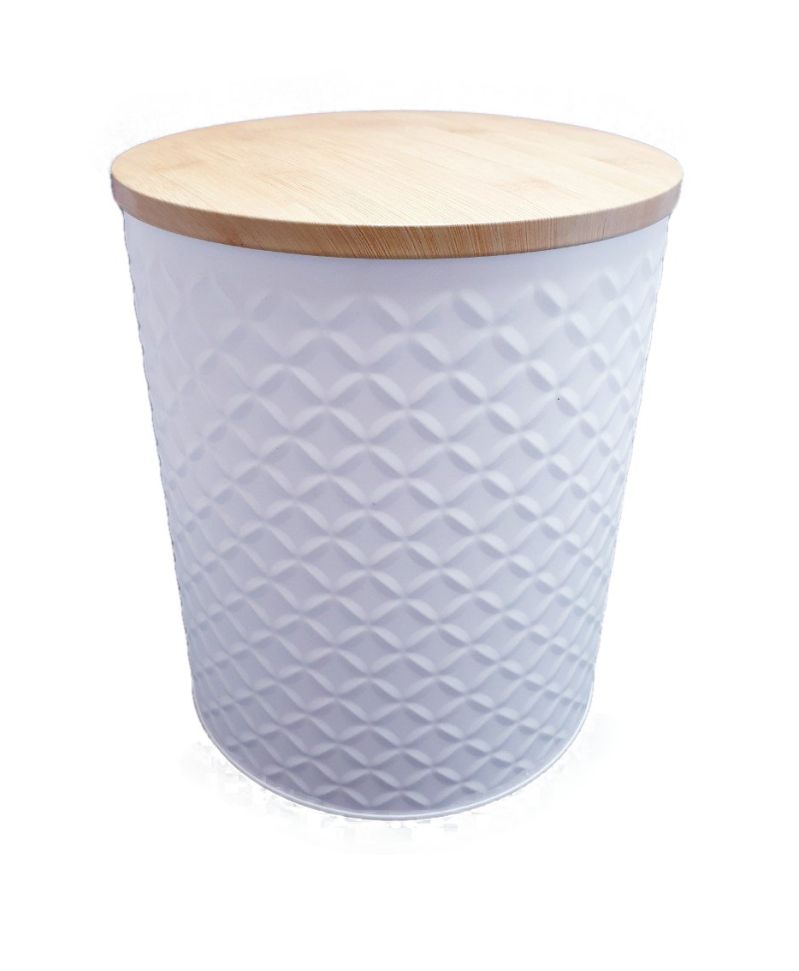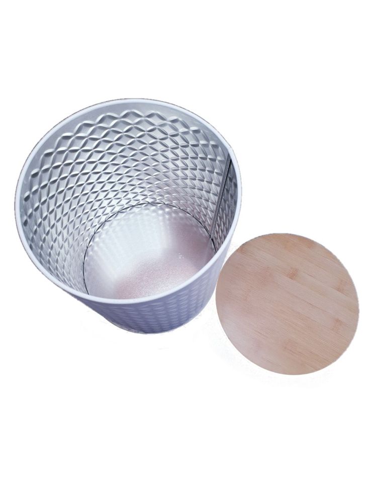 Цилиндрична метална кутия за съхранение с капак, осигуряващ плътно затваряне без опасност от разсипване.