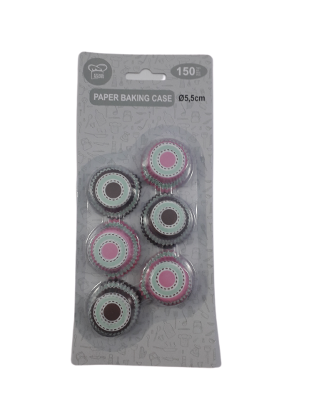 150 броя хартиени формички за печене на мъфини в розово и кафяво със светло синя шарка.