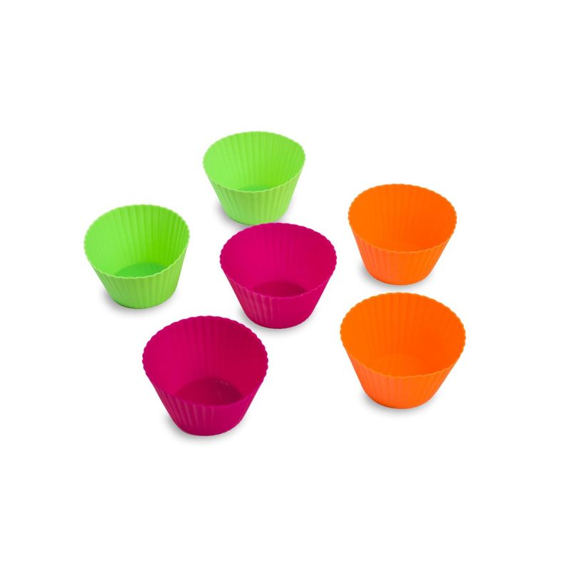 Комплект от 6 броя силиконови форми за печене на мъфини в различни цветове - цикламено, зелено и оранжево.