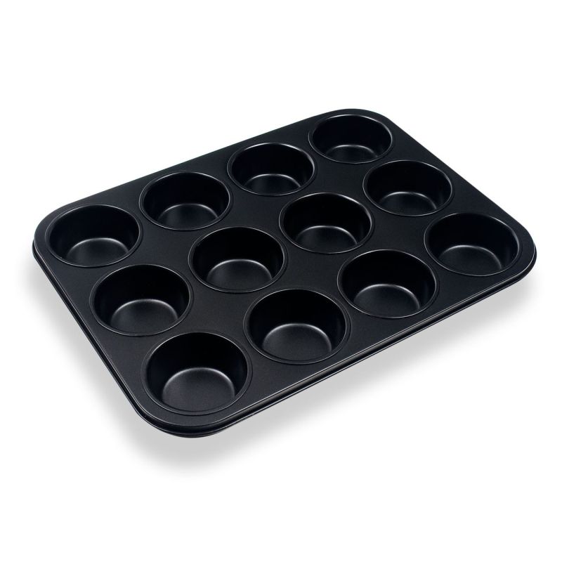 Метална форма в черен цвят за печене на сладки или солени мъфини с 12 гнезда.