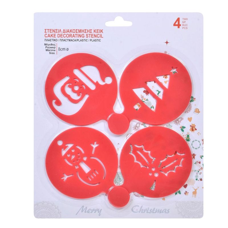 Комплект от 4 броя силиконови шаблони в червен цвят за декорация на кекс, торта или топли напитки с различни коледни мотиви - Дядо Коледа, елха, снежен човек и коледен имел.