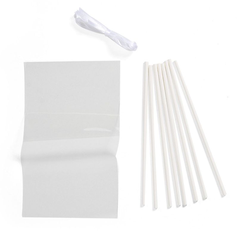 Комплект от 8 броя прозрачни пликове за близалки и бонбони, 8 пръчици за близалки и 8 красиви бели панделки, с които да опаковате пликовете.