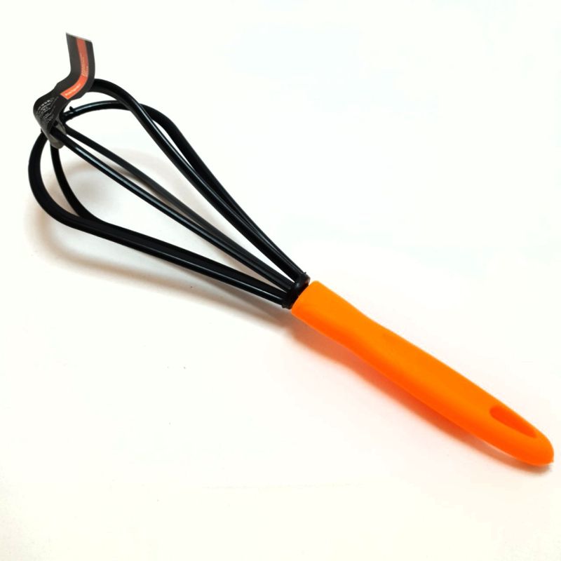 Кухненска бъркалка, изработена от висококачествена пластмаса в черен цвят с оражева дръжка в ергономична форма за по-добър захват.
