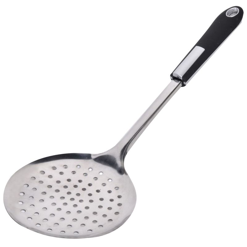 Перфорирана лъжица за сервиране, изработена от неръждаема стомана с гумирана черна дръжка в ергономична форма за максимално удобен захват и ефективност при употреба.