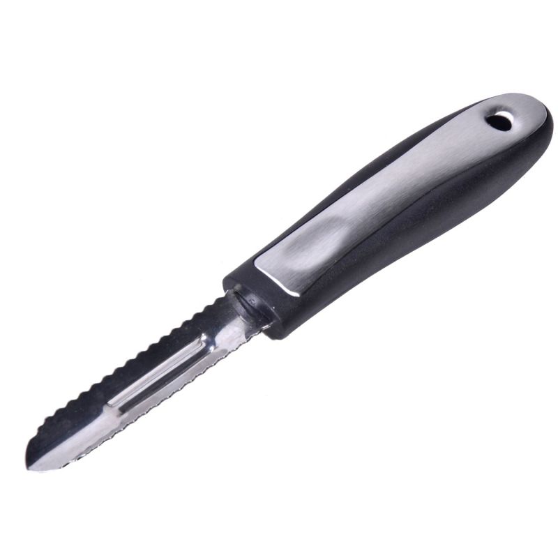 Универсална белачка за зеленчуци и плодове с назъбено острие от висок клас неръждаема стомана с ергономична гумирана дръжка за по-добър захват без опасност от приплъзване.