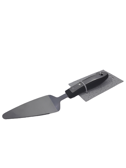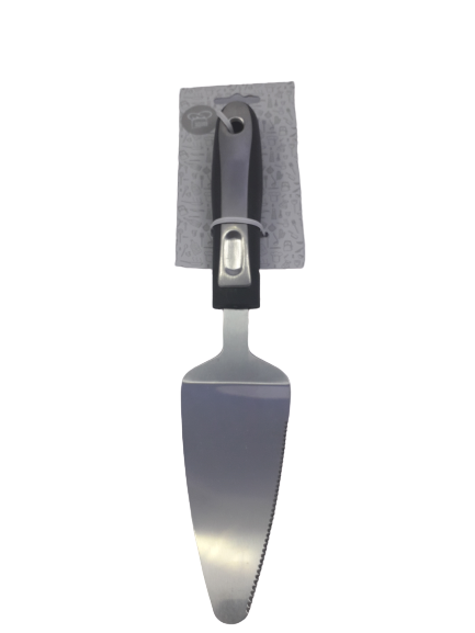 Метална шпатула за сервиране на торта и кекс, изработена от неръждаема стомана с гумирана дръжка в черен цвят за оптимално добър захват при боравене.