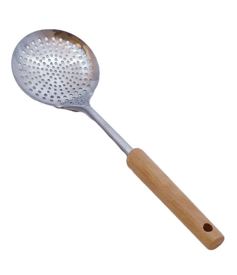 Перфорирана лъжица за сервиране, изработена от неръждаема стомана с дървена дръжка в овална форма за стабилен захват и ефективност при работа.